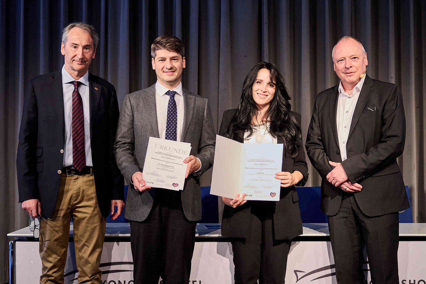 Ausgezeichnet wurden Pauline Bayerle, Medizinische Hochschule Hannover (MHH), Dr. med. Jakob Olfe, Universitäres Herz- und Gefäßzentrum Hamburg, Laura Willinger, Deutsches Herzzentrum München sowie Dr. med. Felix Oberhoffer und Pengzhu Li, M.Sc., Klinikum der Universität München. Die Verleihung wurde von Professor Dr. Bernhard Schwaab, Past-Präsident der DGPR und Mitglied im Vorstand der Deutschen Herzstiftung vorgenommen.